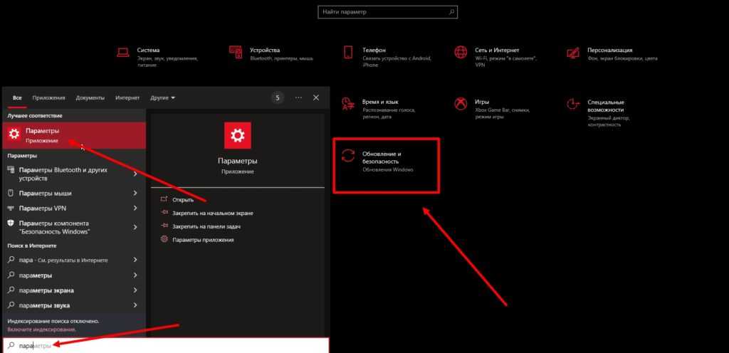 - В левом нижнем углу, в поисковике Windows (значок лупы) наберите «Параметры
