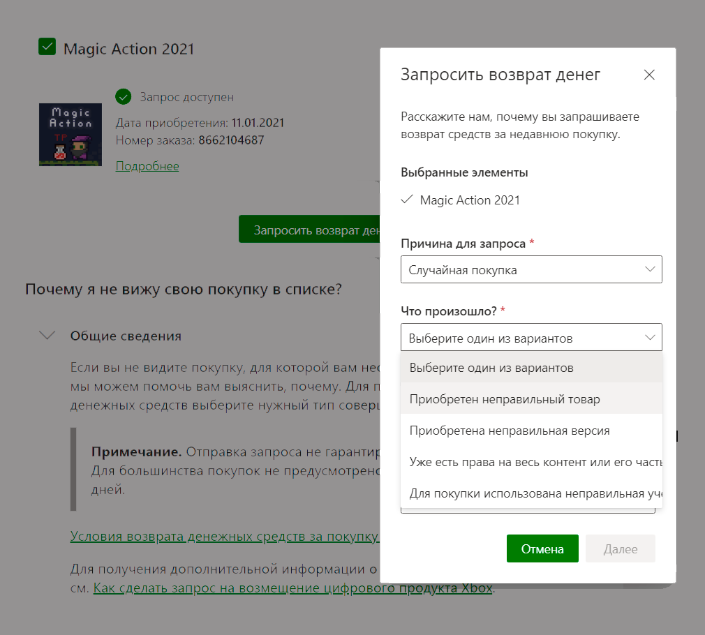 Отобразится список товаров, которые соотносятся с тем, из которого вы перешли к возврату средств. Напомним, что зачастую игры покупаются бандлами, и вернуть деньги только за один проект из набора не получится. Выберите причину для возврата, которая наиболее подходит к вашей ситуации.