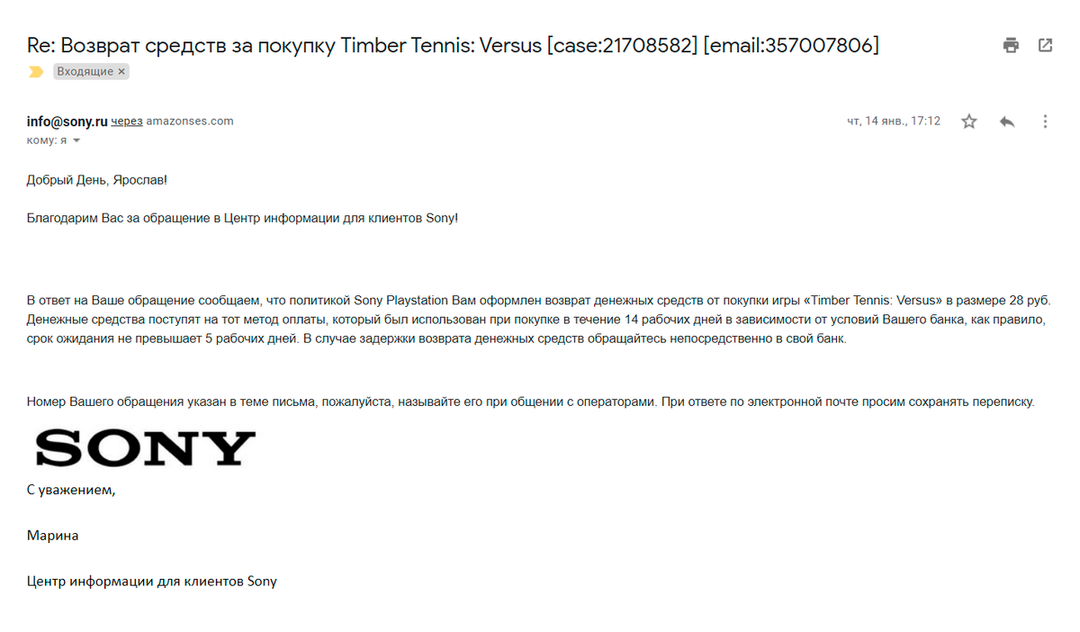 После этого «Сони» одобрит возврат и вернет вам деньги