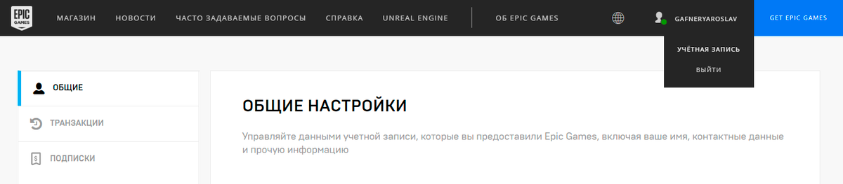 Чтобы вернуть игру, зайдите в Epic Games Store в браузере, нажмите в правом верхнем углу на свой никнейм и в выпавшем меню кликните на пункт «Учетная запись».