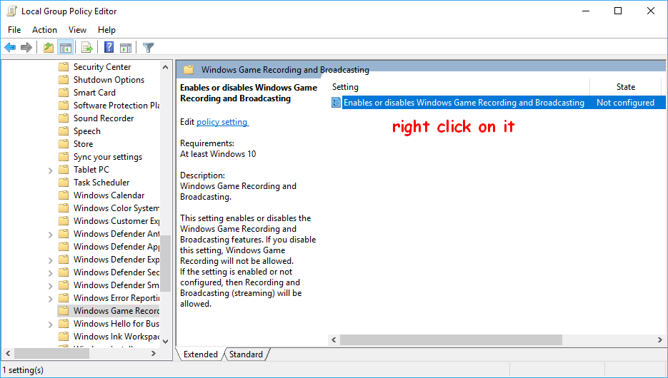- Щелкните правой кнопкой мыши Включает или отключает запись и трансляцию игр Windows из правой панели.