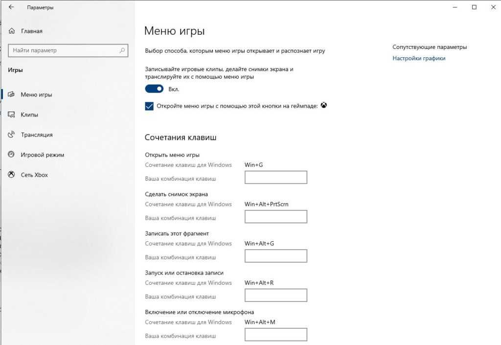 В глобальных параметрах Windows 10 присутствует специальный раздел “Игры”, в котором можно настраивать горячие клавиши, а также иные параметры Xbox Game Bar: