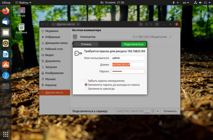 После этого система предложит ввести имя пользователя и пароль для доступа к общему ресурсу. Этот пользователь должен реально существовать на машине, к которой вы собираетесь подключится.