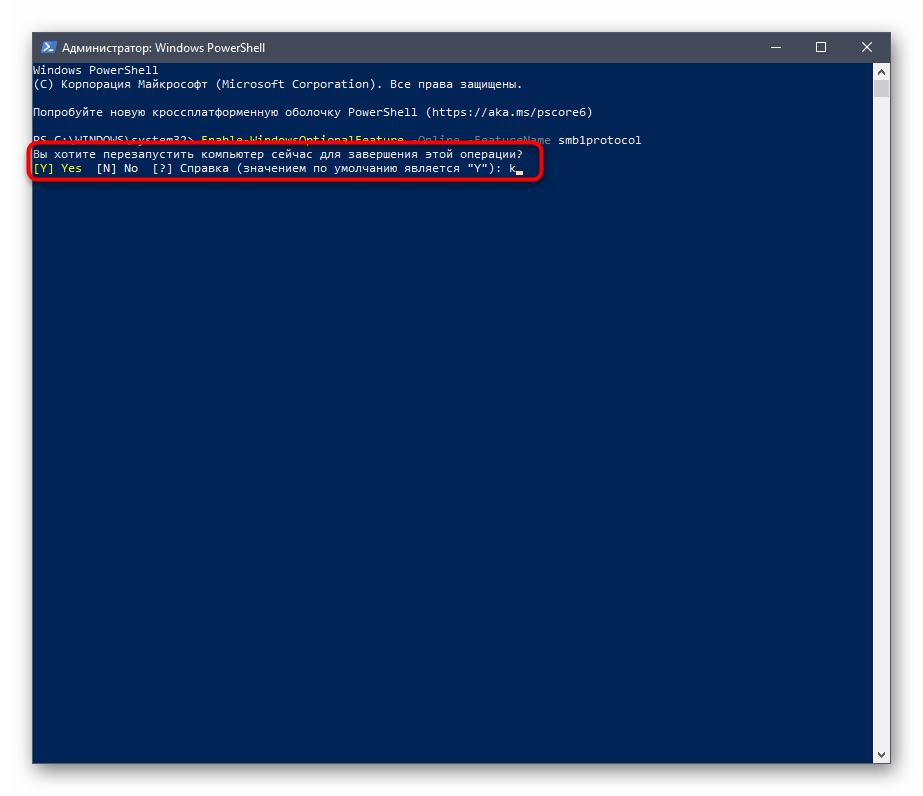 Далее в PowerShell отобразится информация о том, что SMBv1 была успешно активирована и находится в рабочем состоянии.