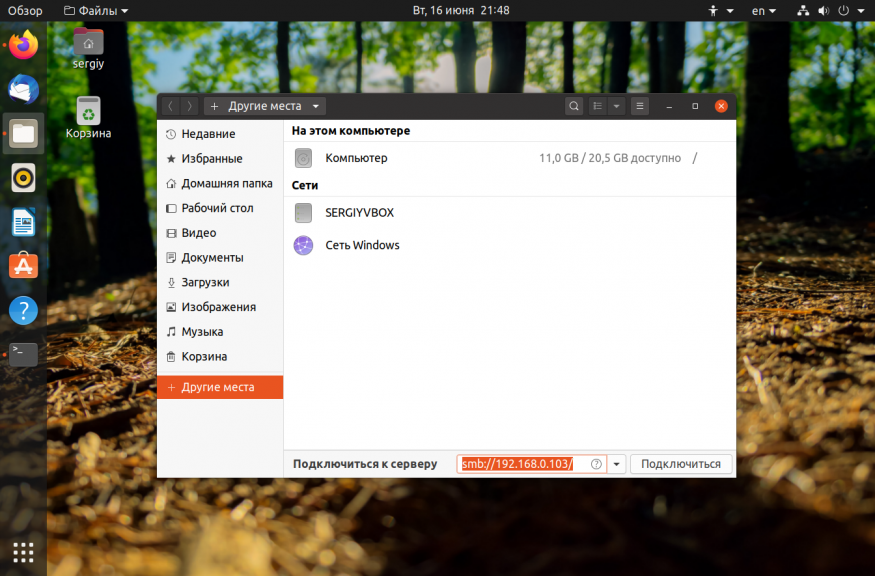 Даже если у вас не работает обнаружение сетевых ресурсов Windows, вы все ещё можете подключится к нужному компьютеру и получить с него файлы. Откройте пункт Другие места на левой панели Nautilus. Внизу окна вы увидите надпись Подключится к серверу введите smb://адрес_сервера в поле слева и нажмите Enter: