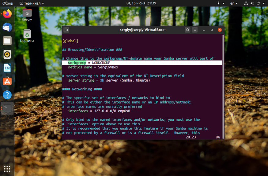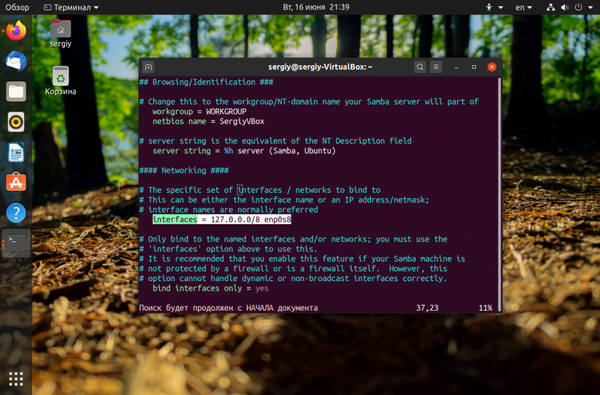 Затем найдите в /etc/samba/smb.conf параметр interface и замените в его значении eth0 на имя вашего интерфейса, который обеспечивает связь с нужной локальной сетью. Например на enp0s8: