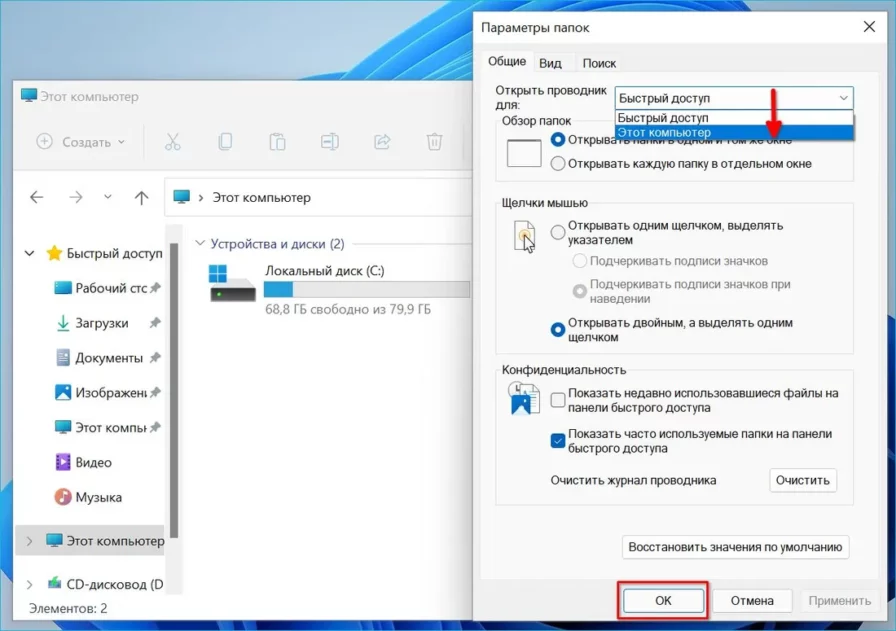 В дальнейшем каким бы способом вы ни открывали Проводник — откроется «Этот компьютер». Если необходимо вернуться к стандартному представлению Проводника — проделайте описанные выше действия и поменяйте «Этот компьютер» на «Быстрый доступ», а затем щелкните «ОК».