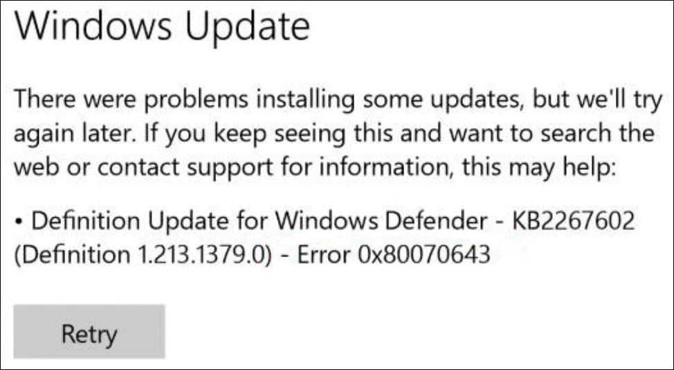 Обновление определения для Защитника Windows — KB2267602 (Определение 1.213.1379.0) — Ошибка 0x80070643.