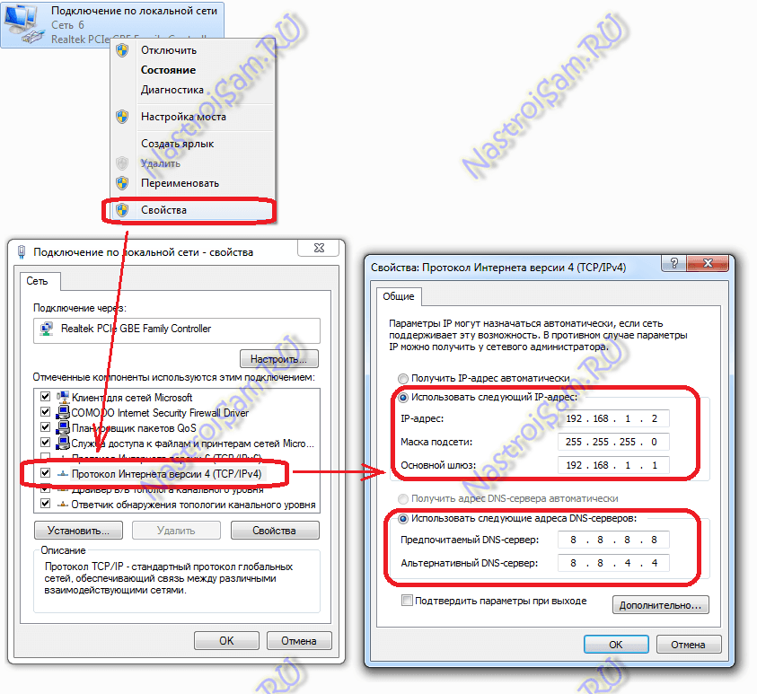 К примеру, если ваш вай-фай роутер, который подключается к ПК по локальной сети, имеет IP- адрес «192.168.1.55», то в настройках IPv4 в раздел «IP-адрес» необходимо указать, например, 192.168.1.10, а в «Основной шлюз» и «Предпочитаемый DNS-сервер» сменить последние две цифры на 1 и 55 соответственно.
