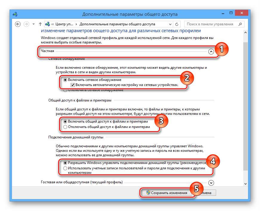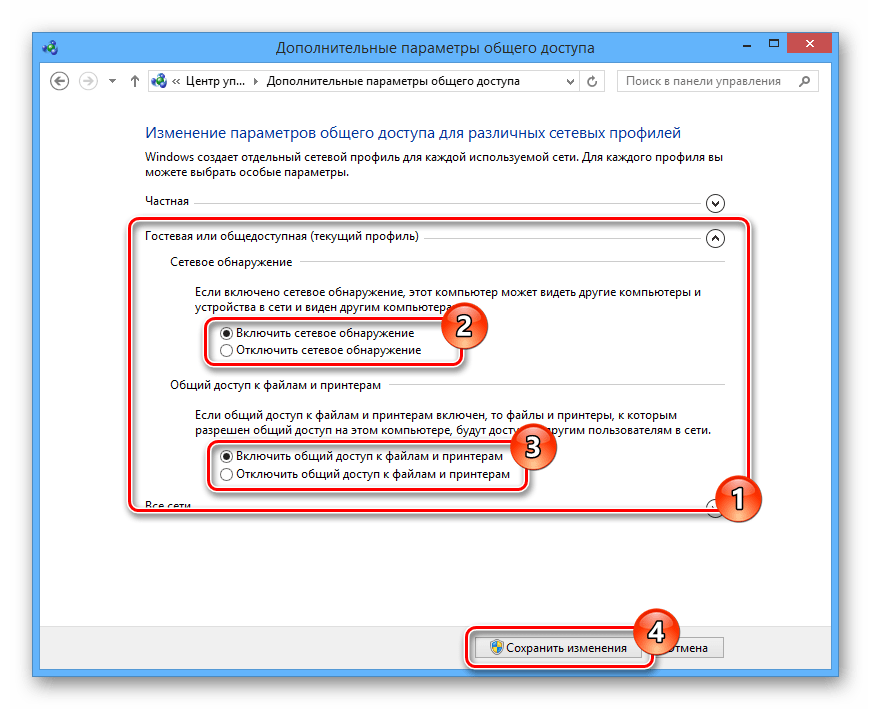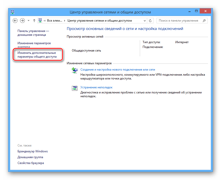 Одним из первых действий при подобной ошибке будет просмотр и корректировка настроек общего доступа. Для этого следует выполнить следующее: