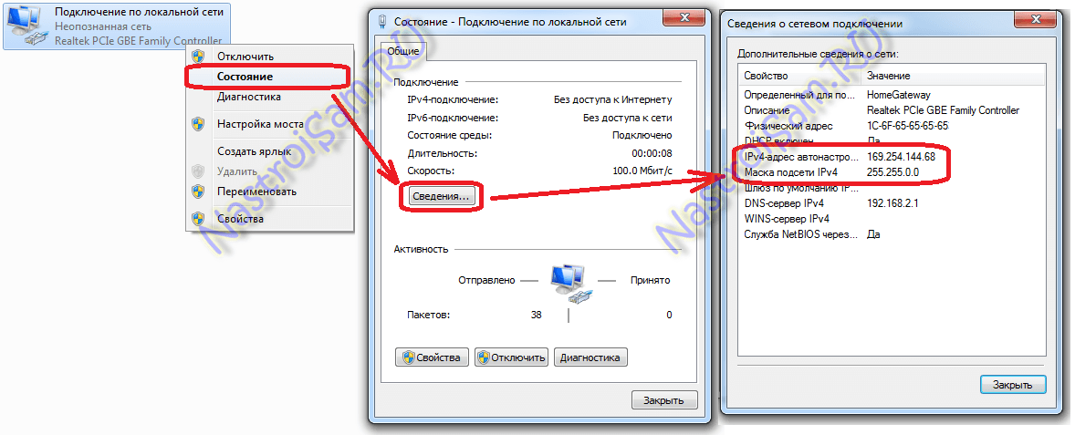 Чаще всего такое возникает после переустановки операционной системы Windows и означает что на физическом и канальном уровнях подключение к сети есть, но вот на сетевом уровне его уже нет. Говоря простым языком — проблема с IP-адресом — скорее всего система не может его получить динамически. Если у Вас IP-адрес прописан вручную, то вероятно он либо прописан неправильно, либо подсеть изменилась. Выбираем сетевое подключение (по локальной сети или беспроводное), через которое подключены и кликаем на нем правой кнопкой и в контекстном меню выбираем пункт «Состояние»: