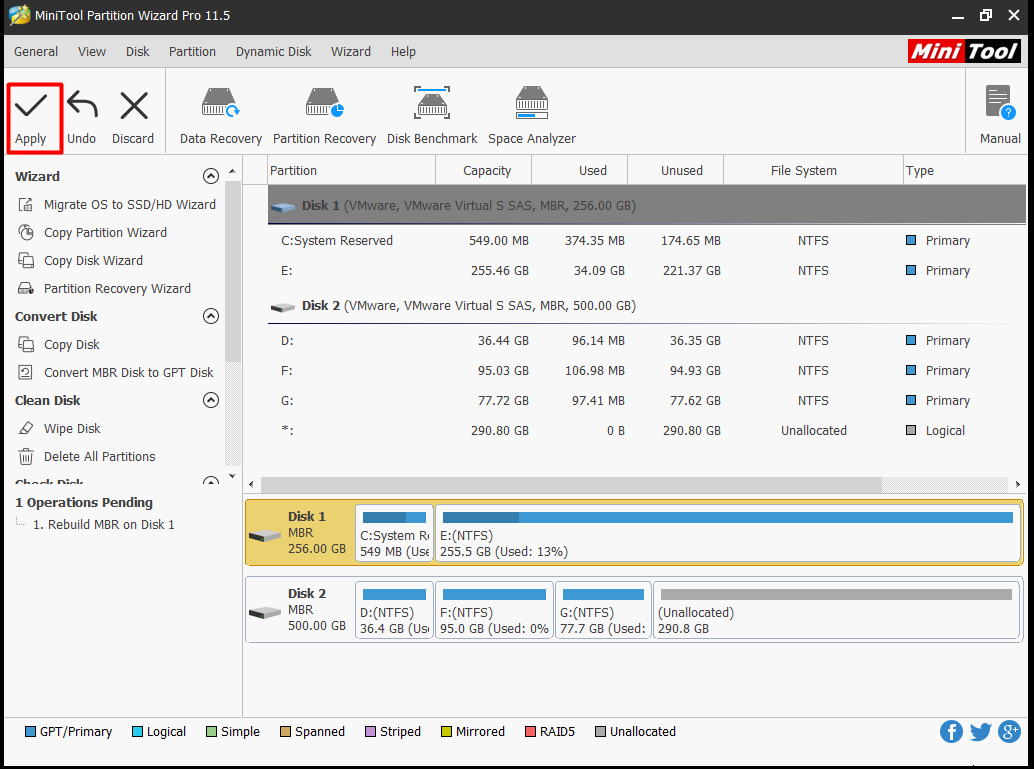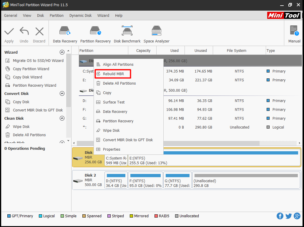 You can rebuild your MBR to fix MBR error 1 Windows 10 via a professional software – MiniTool Partition Wizard. If you don’t have Windows installation media, MiniTool Partition Wizard Pro Edition enables you to create a Bootable Media with ease.