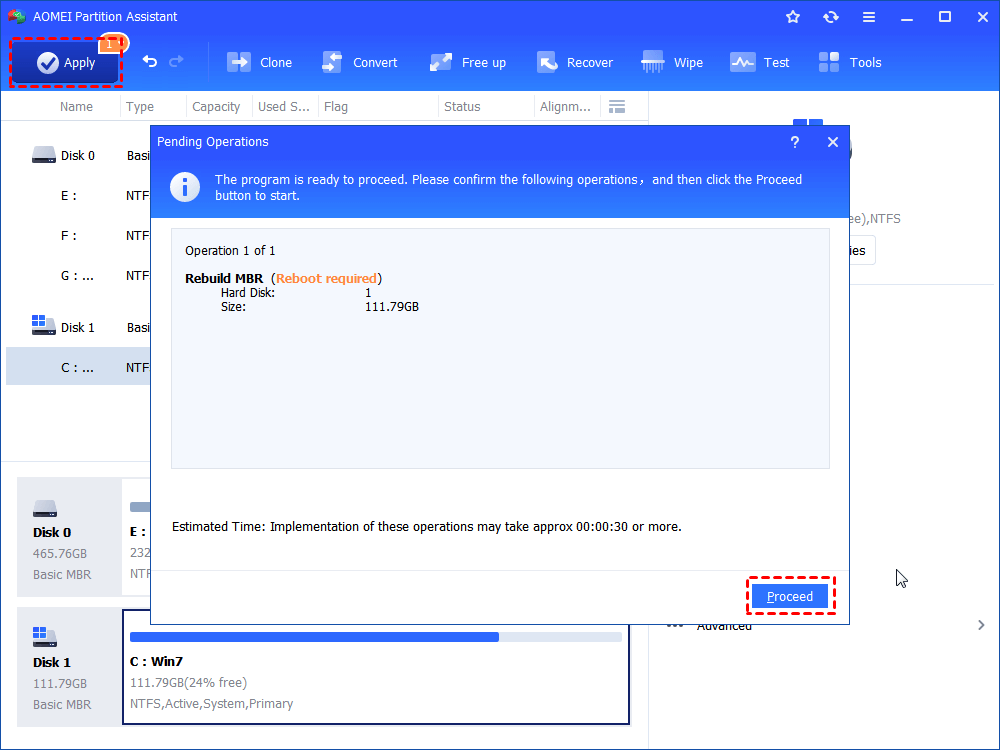 Далее нажмите кнопку «Выполнить 1 операцию» в верхнем левом углу, а затем др. кнопку — «Применить». После этого ваш компьютер снова сможет нормально загружаться.