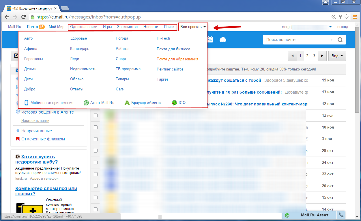 из аккаунта почты Майл.ру имеется быстрый доступ к другим проектам Mail.ru, например Одноклассники, Знакомства Майл и т.д.;