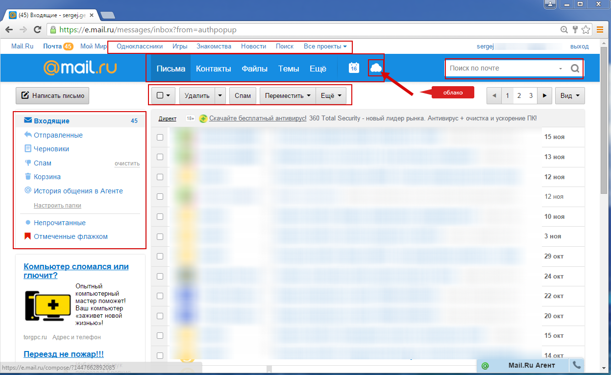 Зарегистрировавшись и выполнив вход в почту мэйл.ру открываются следующие возможности: