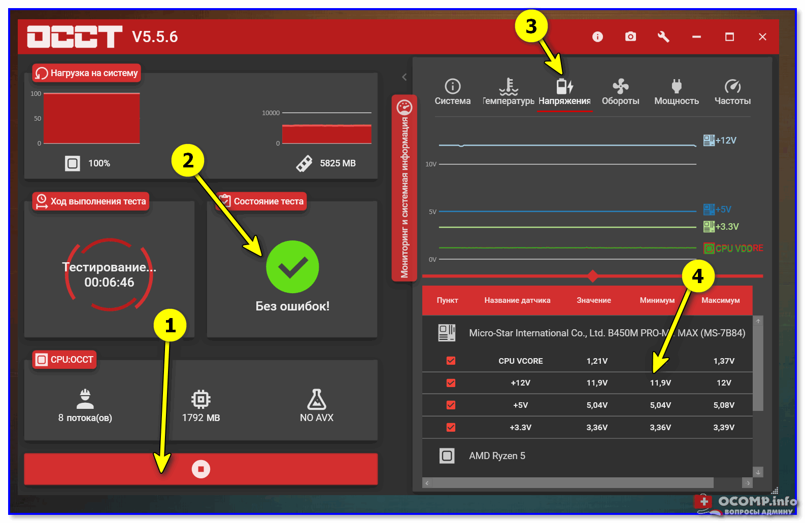 OCCT (программа для тестирования ПК) — вкладка с напряжениями