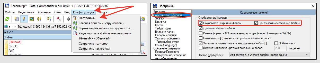 Первым делом открываем меню «Конфигурация» — «Настройка». В левой части окна выберите раздел «Содержимое панелей», а справа включите опции «Показывать скрытые файлы» и «Показывать системные файлы», после чего нажмите «Применить» и «ОК».