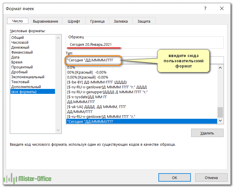 - На вкладке Число выберите Все форматы в списке и запишите нужный формат даты в поле Тип. Это показано на скриншоте ниже.