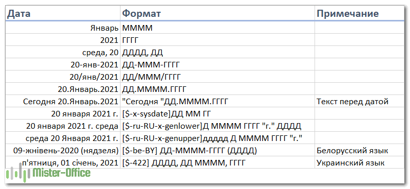 При настройке пользовательского формата даты вы можете использовать следующие коды.
