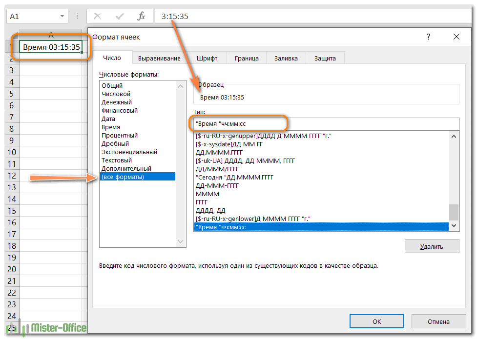 Хотя Microsoft Excel предоставляет несколько различных форматов времени, вы можете создать свой собственный, который лучше всего подходит для конкретной задачи. Для этого откройте знакомое нам окно настроек, выберите “Все форматы» и введите подходящее время в поле “Тип» .