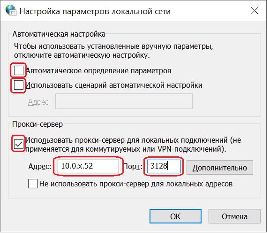 - В активных полях «Адрес» и «Порт» нужно ввести ip proxy и порт (для каждого региона ip proxy индивидуальные и различаются в 3-м октете ip адреса), далее нажать кнопку ОК (рис.3).