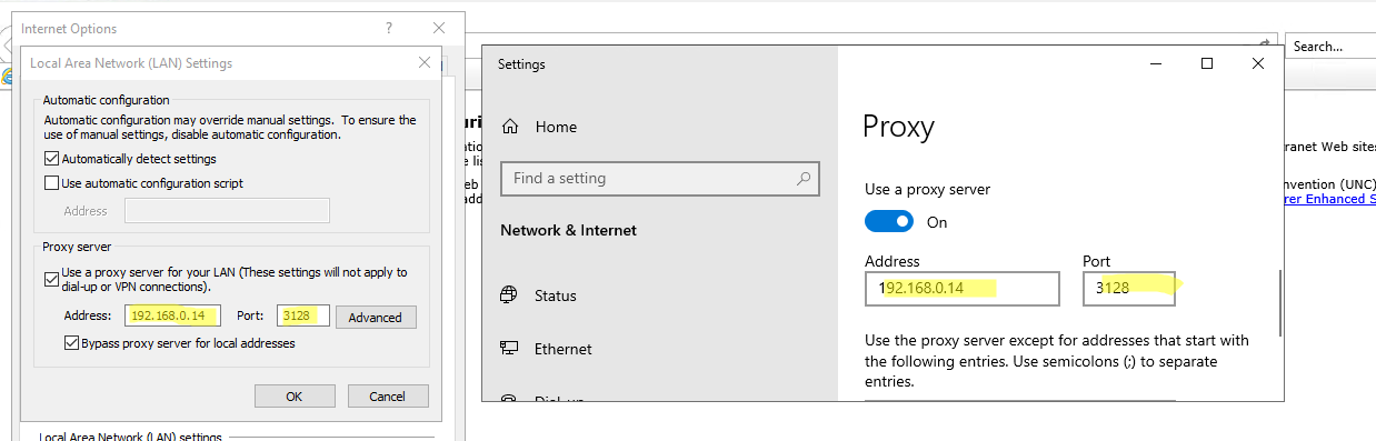 - Toggle on the Use a proxy server check box in the pop window that appears and type in the IP address of the server given to you and the port. for example, 15.24.22.01 and port number is 8080