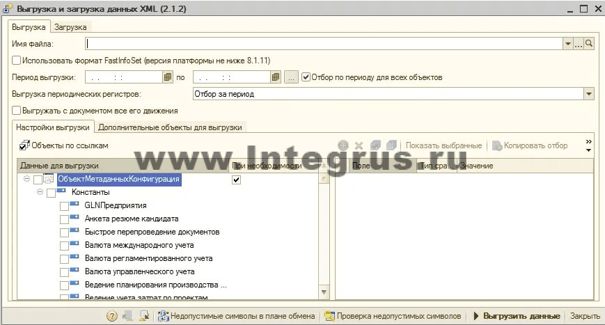 Данный способ может повлечь потерю данных, поэтому его рекомендуется использовать только опытным пользователям. Способ схож с предыдущим и заключается в том, что сначала база выгружается, (только не в .dt, как в предыдущем способе, а в специальный формат .XML). Затем база загружается обратно. Делается это с помощью встроенной обработки “Выгрузка и загрузка данных XML”.