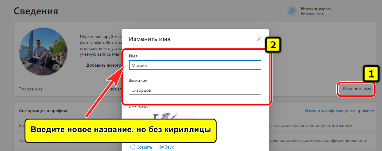 - В браузере откроется страница для настройки профиля. Нужно кликнуть на иконку учётной записи, далее — выбрать «Изменить имя». Ввести новое название, но без кириллицы.