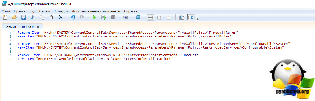 Remove-Item «HKLM:\SYSTEM\CurrentControlSet\Services\SharedAccess \Parameters\FirewallPolicy\RestrictedServices\Configurable\System» New-Item «HKLM:\SYSTEM\CurrentControlSet\Services\SharedAccess \Parameters\FirewallPolicy\RestrictedServices\Configurable\System» Remove-Item «HKLM:\SOFTWARE\Microsoft\Windows NT\CurrentVersion \Notifications» -Recurse New-Item «HKLM:\SOFTWARE\Microsoft\Windows NT\ CurrentVersion\Notifications»
