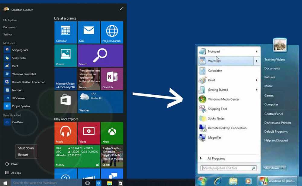 Главным отличием новой реализации этого элемента интерфейса стало объединение классических пунктов меню и живых плиток. Расширились и возможности настройки: теперь каждый может настроить меню Пуск под себя.