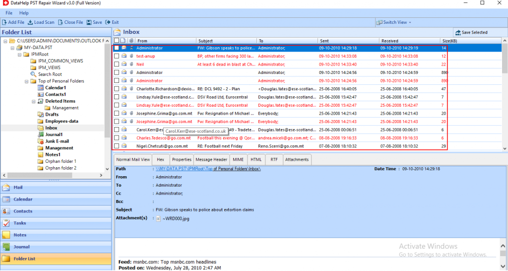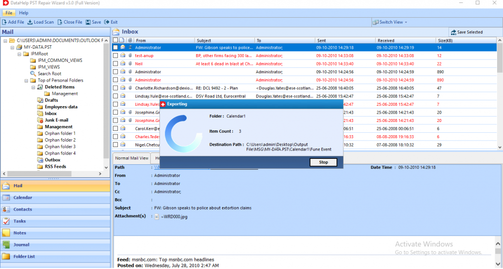 Шаг 3: Теперь процесс сканирования запускается. Предварительный просмотр всех контактов, заметок, задач, журналов, списка папок, календарей, выделенных красным цветом на левой панели программы.