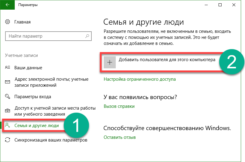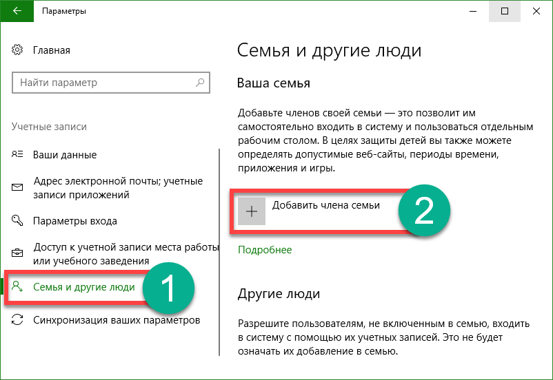 - В левой стороне окна, которое мы открыли шагом раньше, кликаем по надписи: «Семья и другие люди», а в правой жмем пункт, обозначенный на скриншоте цифрой «2».