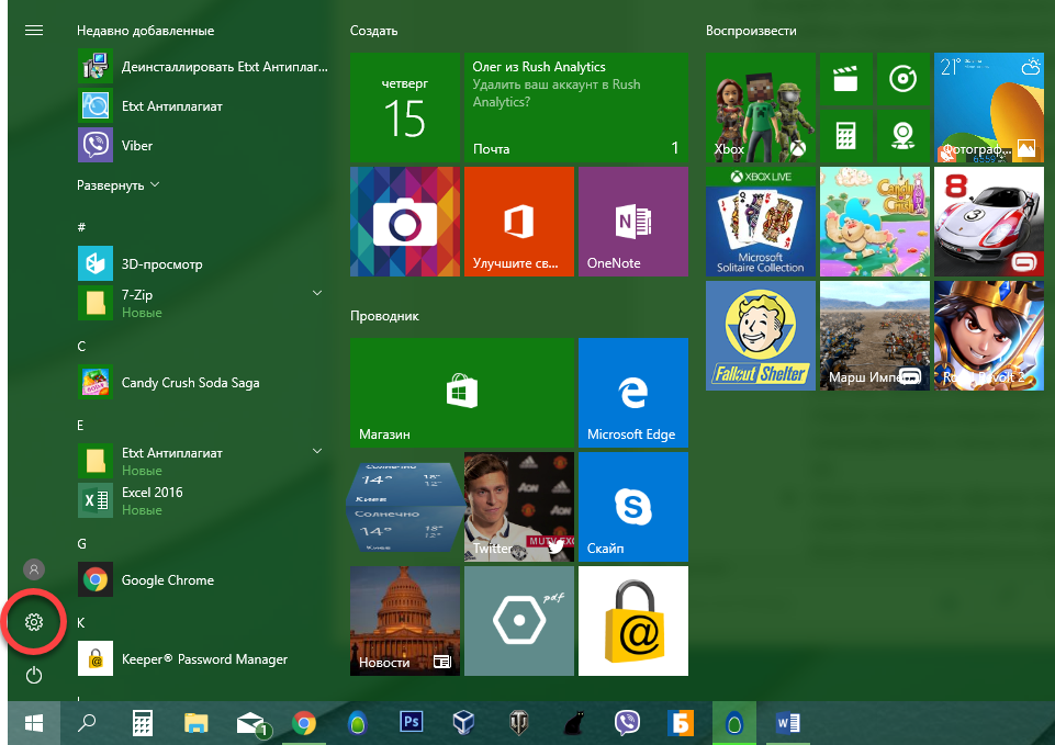 - Сначала откроем параметры Windows Для этого перейдите в меню «Пуск» и кликните по иконке шестеренки, которую можно найти в нижней левой стороне окна.
