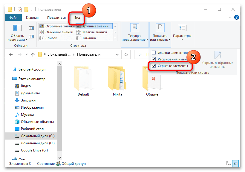 - Скопируйте файл «NTUSER.DAT» на флешку с любого рабочего ПК с той же операционной системой. Для этого перейдите в расположение , переключитесь в «Проводнике» на вкладку «Вид» и включите отображение скрытых элементов.