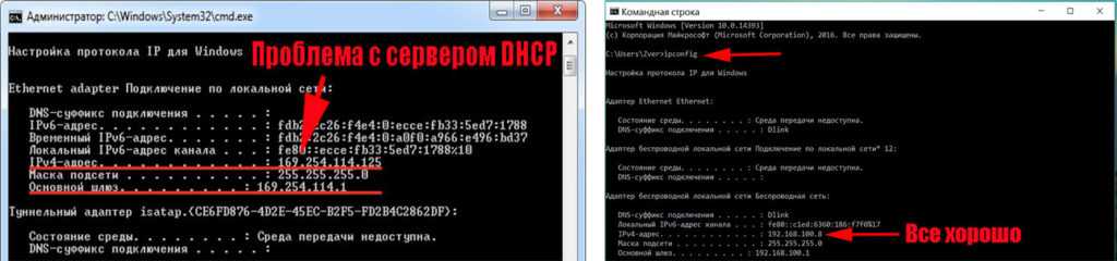 Откройте командную строку, как это делать мы уже показывали в этой статье выше. Вбейте команду « ipconfig». Если напротив графы «IP адрес» будет непонятный набор цифр, типа «169.253…..», значит проблема все-таки с DHCP сервером.