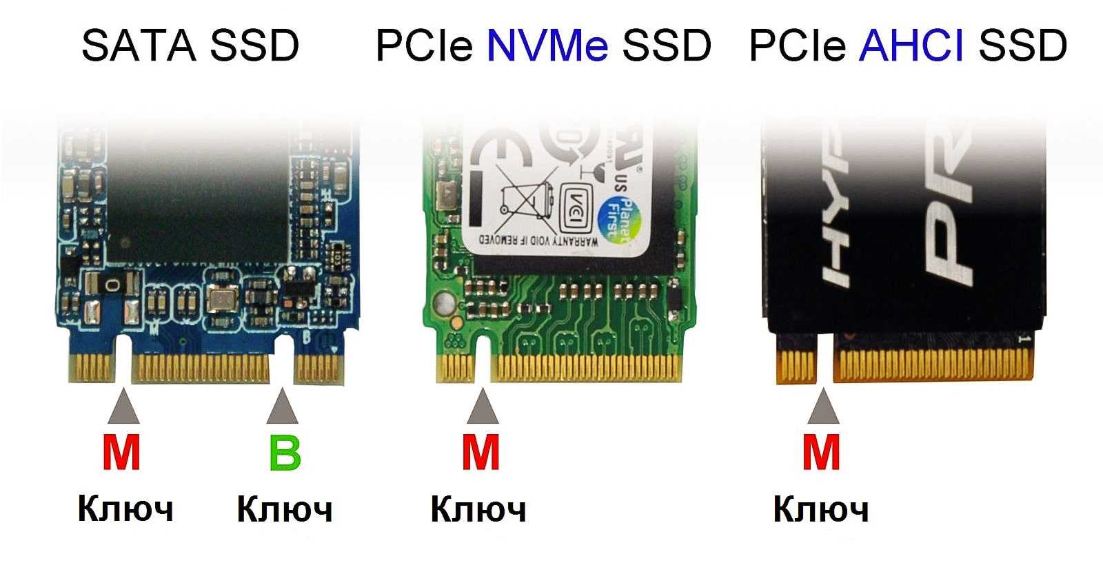 Слот AHCI нас не волнует, он устаревший и сейчас почти не используется, ему на смену пришел NVMe. Стрелочки на картинке ниже наглядно показывают, что SATA (M, B) девайс легко можно вставить в NVMe и он будет работать, а вот современный NVMe (B) всунуть в SATA физически невозможно, так что не переживайте, если не применять силу, то вы ничего не сломаете.