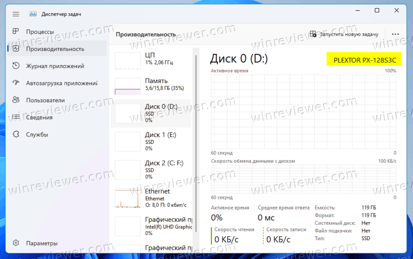 - Наконец, на вкладке «Производительность» выберите диск. Вы увидите, является ли это SSD или HDD, так как это указано и слева, и справа.