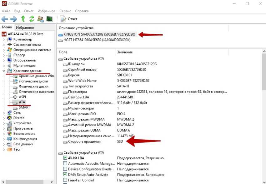 В нашем примере первый диск – это HDD (HGST HTS541010A9E680), а второй — SSD (KINGSTON sa400s37120g).