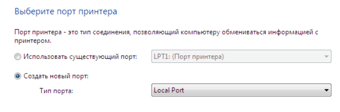 - В следующем окне «Выберите порт принтера» нужно поставить точку на чекбоксе Create a new port и выбрать тип порта — Local port.