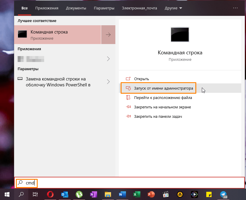 В поле поиска Windows введите CMD, затем щелкните правой кнопкой мыши Командная строка и выберите Запустить от имени администратора.