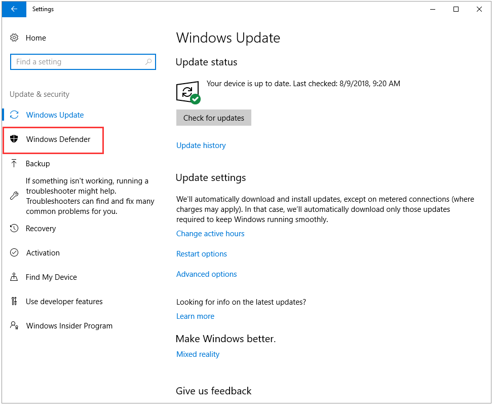 Step 2: Select Settings, Update & security, and Windows Defender in order.
