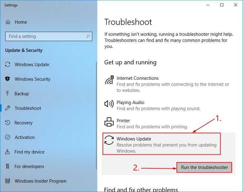 Первым делом нужно запустить стандартный способ для исправления подобных ошибок. Откройте “Параметры” > “Обновление и безопасность” > “Устранение неполадок” > “Центр обновления Windows“.