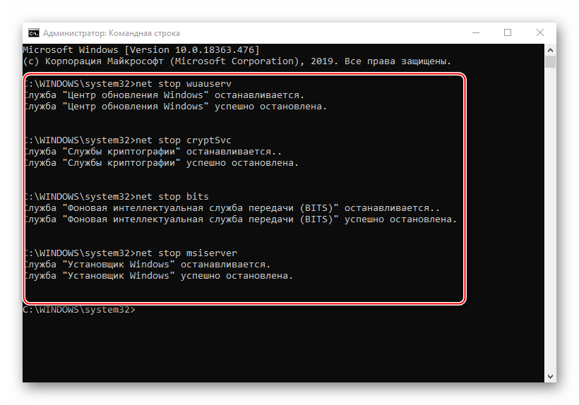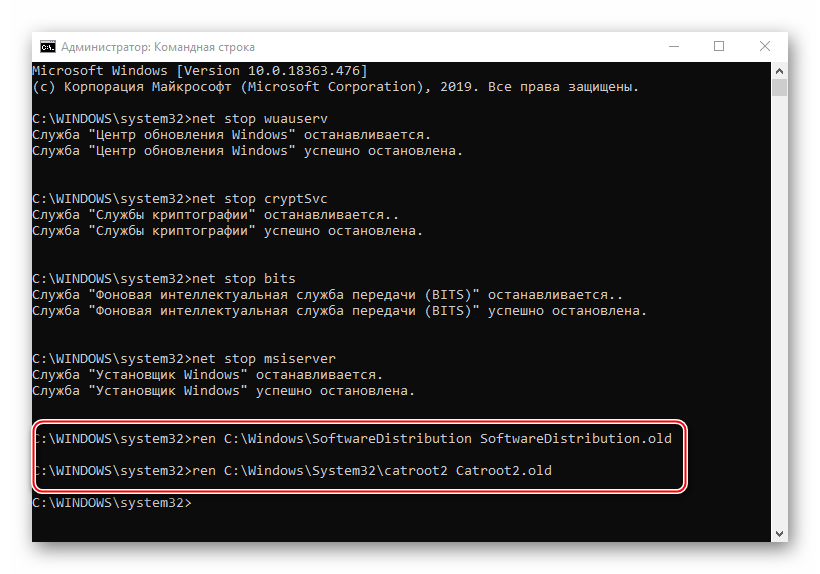 net stop wuauserv net stop cryptSvc net stop bits net stop msiserver ren C:\Windows\SoftwareDistribution SoftwareDistribution.old ren C:\Windows\System32\catroot2 catroot2.old net start wuauserv net start cryptSvc net start bits net start msiserver