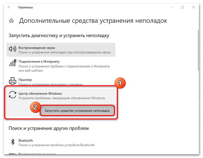 Выберите средство устранения неполадок Центра обновления Windows и запустите его.