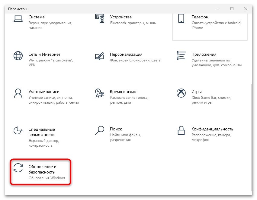 В новом окне перейдите в раздел «Обновление и безопасность».