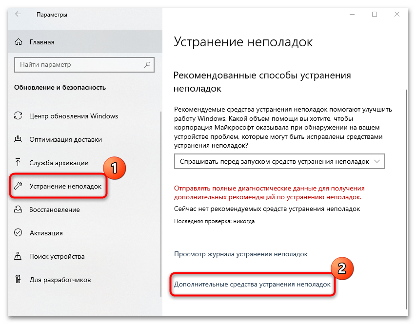 Далее слева нажмите на вкладку «Устранение неполадок», а в основной части окна воспользуйтесь ссылкой «Дополнительные средства устранения неполадок».