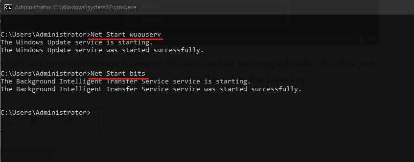Теперь вам нужно остановить Центр обновления Windows и фоновые интеллектуальные службы передачи. Для этого вы можете ввести следующие команды одну за другой, за каждой из которых следует клавиша Enter: