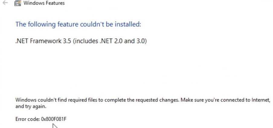 - Windows couldn’t find the required files to complete the requested changes. Make sure you’re connected to Internet, and try again. Error: 0x800f081f.