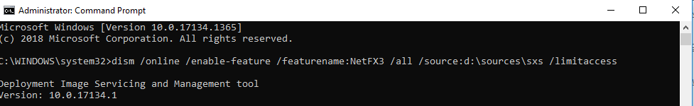 - In the command prompt window, you should type this command and hit enter; Dism /online /enable-feature/featurename:NetFx3 /All /Source:<DRIVE>:\sources\sxsLimitAccess”, remove the quotes and also replace “DRIVE” with your drive name where your installation media is located. It should be something like “D:”.
