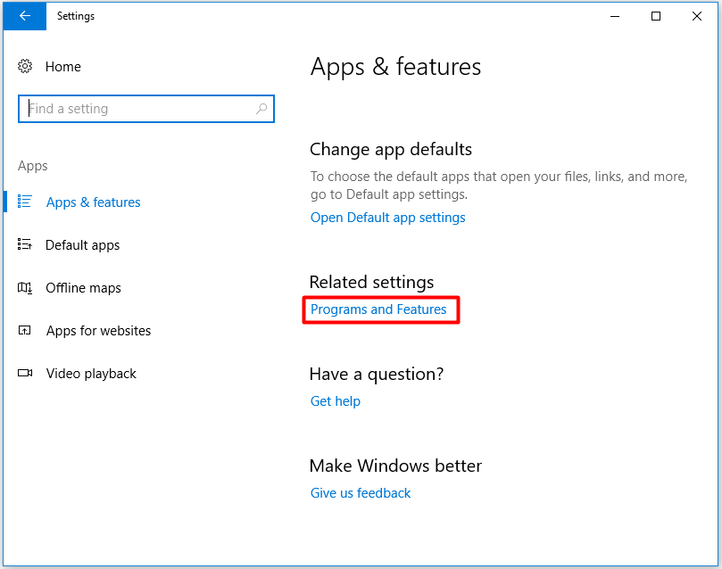 Step 1: Open Windows Settings by pressing Win and I keys and click on Apps on the main interface. Then, move to the right side of the window and scroll down the settings until you find the Related Settings tab. Click Programs and Features to go on.